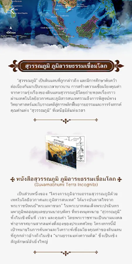 Applications for presenting spatial information to link the economic, social and cultural aspects of the land of Suvarnabhumi from the past to the present and the future. Presenting information on the civilization of Suvarnabhumi and the civilization position with details of evidence that has been discovered