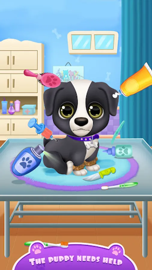 It's bath time! Rottweiler Pet dog is so dirty and all clothes are messed up. Remove all the city clothes and give a nice bubble bath to a cute puppy.