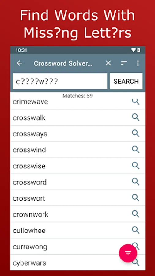 Use ? (press space) to represent a missing letter, try c????w??? to find clockwork and crossword