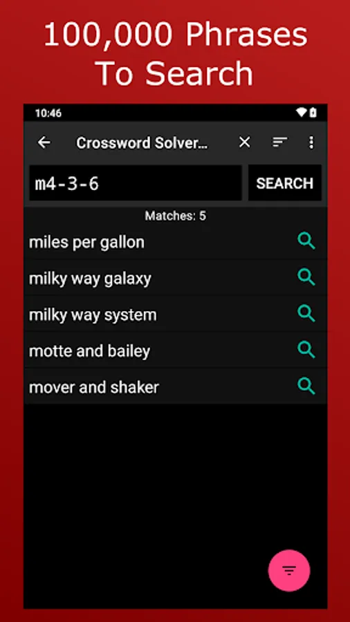 Search over 100K built-in phrases, use a hyphen to denote a space, try m????-???-?????? to find motte and bailey, miles per gallon and milky way galaxy