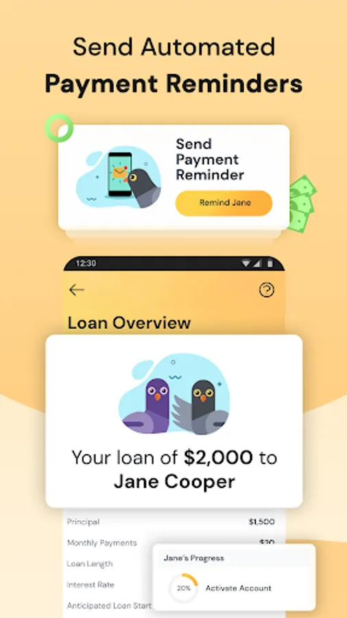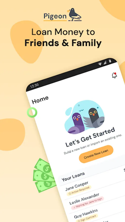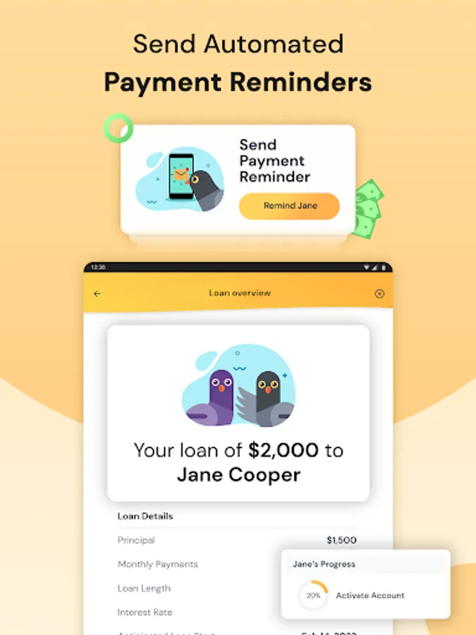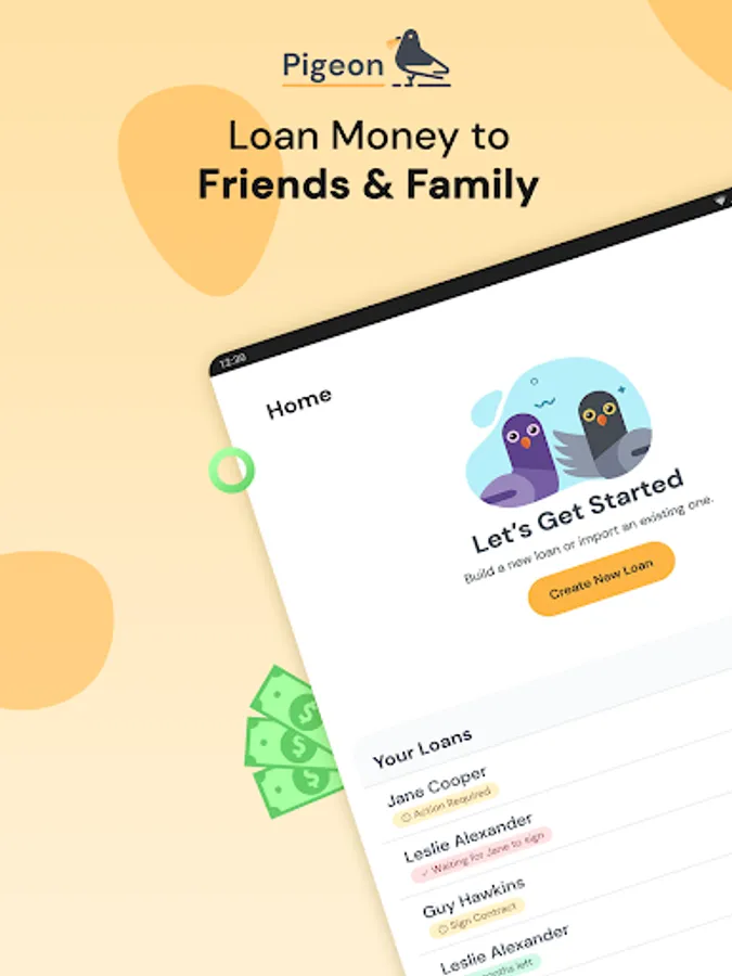 Monitor loans, control debt payoff conditions, and maintain healthy relationships with those you care about. Download Pigeon for the ultimate money lending app that eliminates the stress, anxiety, and awkwardness of private money borrowing.