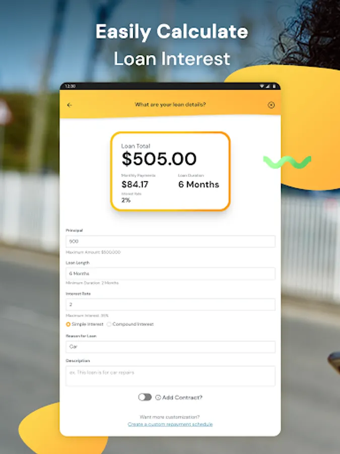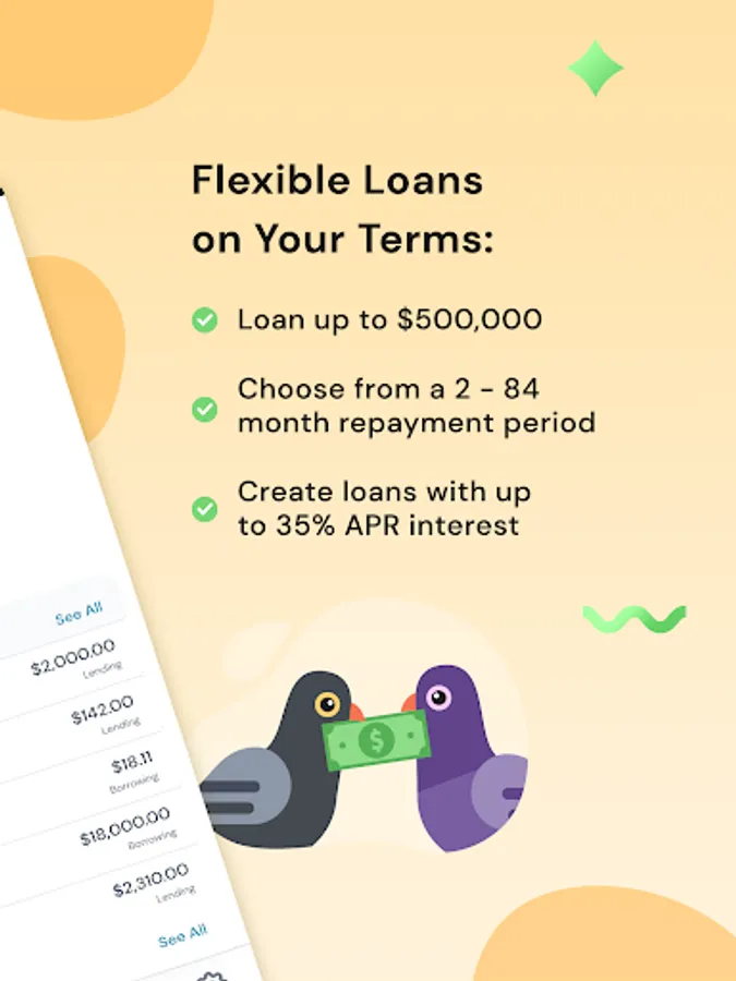 Lend friends money and create loans with easy to understand contracts and tools that make loan management simple. Pigeon loans are customizable – set your own loan terms and define length, principal amount, and interest rate so you can lend money confidently. Whether you’re covering a family emergency, supporting a new business, or helping with a big purchase, Pigeon has your back. Download Pigeon’s all-in-one online money lending app to set up loans and send money to your loved ones today.