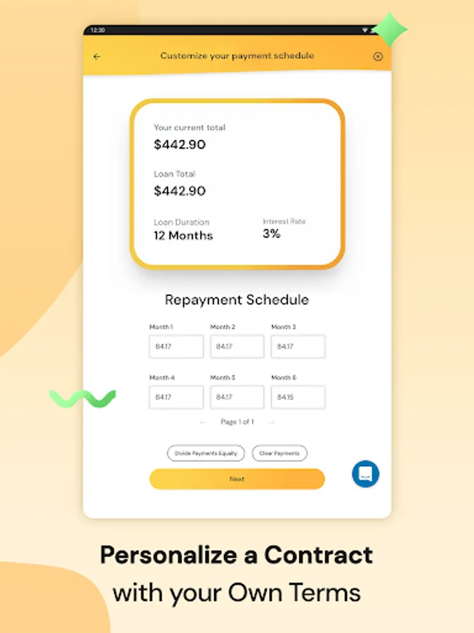 You’re giving a friend, business partner, or family member $1,000, and want to get paid back at least $100 a month until you’re fully repaid. You'll set up your repayment period for 10 months, and add a 1% interest rate. After receiving those details, we'll do the rest of the work for you!