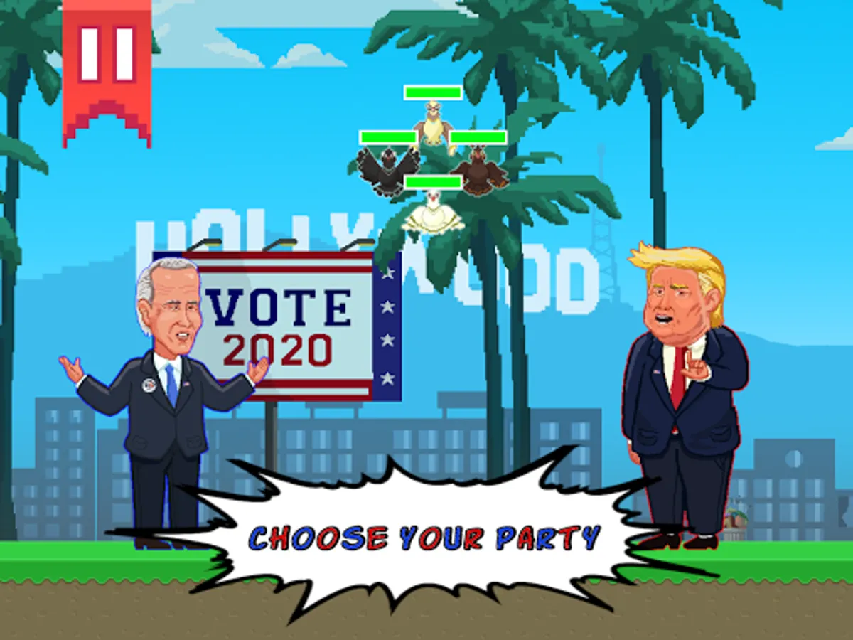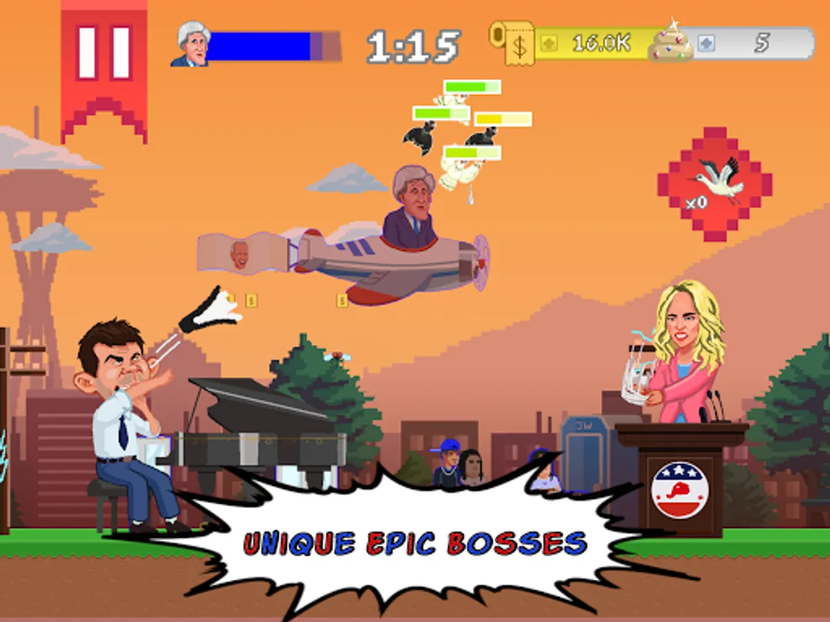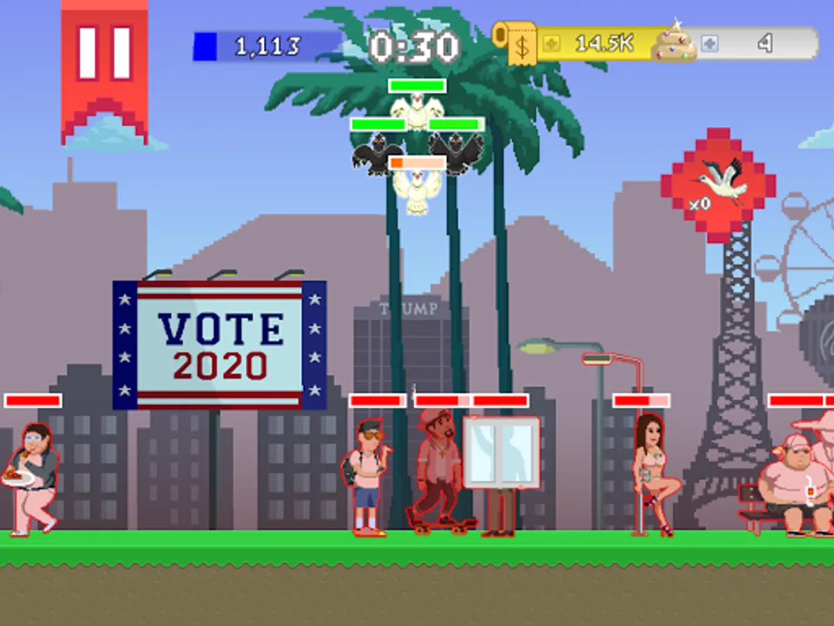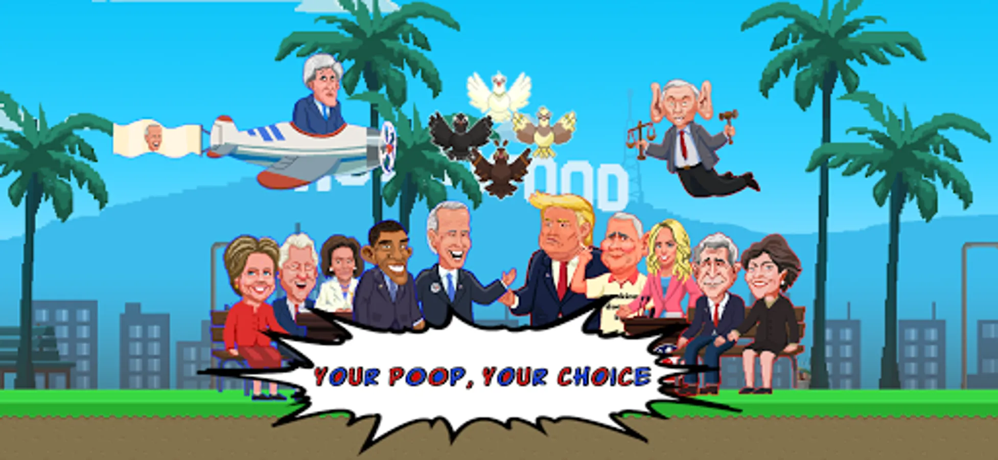 Each level is in an iconic US city. In eac, our pigeons encounter some people from that city! When birds poop on the Republican or Democrat people, they say funny things and react differently based on their character! Some laugh at you, some throw stuff at you, some take cover and some run away. However after you poop enough on anybody, they will change their political party! Pigeons are not alone on their pooping journey. Other birds such as storks, sparrows and owls join them too!