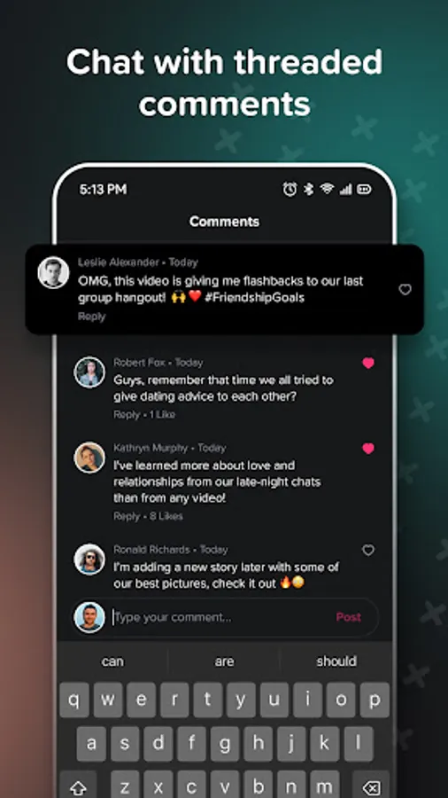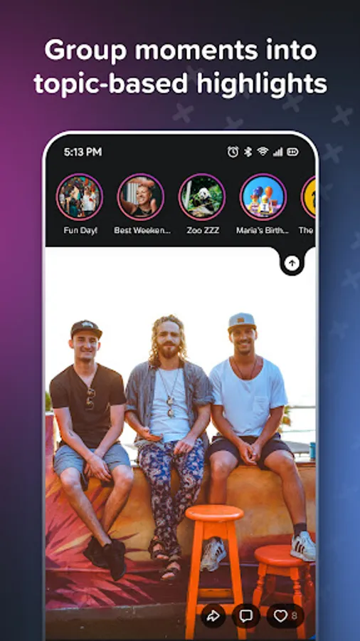 You can open as many groups as you wish, invite your favorite people and decide who can post and who can't. Stories can also be shared outside of the group and be viewed on the web without downloading the app. Important stories can be gathered and saved in your group highlights (and not in a specific person profile page, as in Instagram).