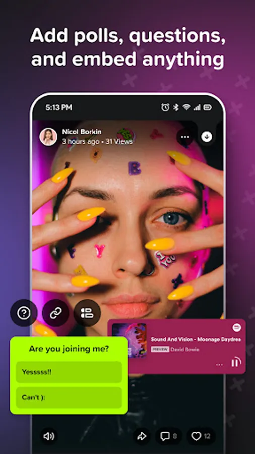 Stories can include text, photos, videos, GIFs, quizzes and links but also YouTube videos, songs and playlists from Spotify, TikTok videos, Google Maps and basically any site that allows embedding of their content. Stories can be one page or multiple pages.