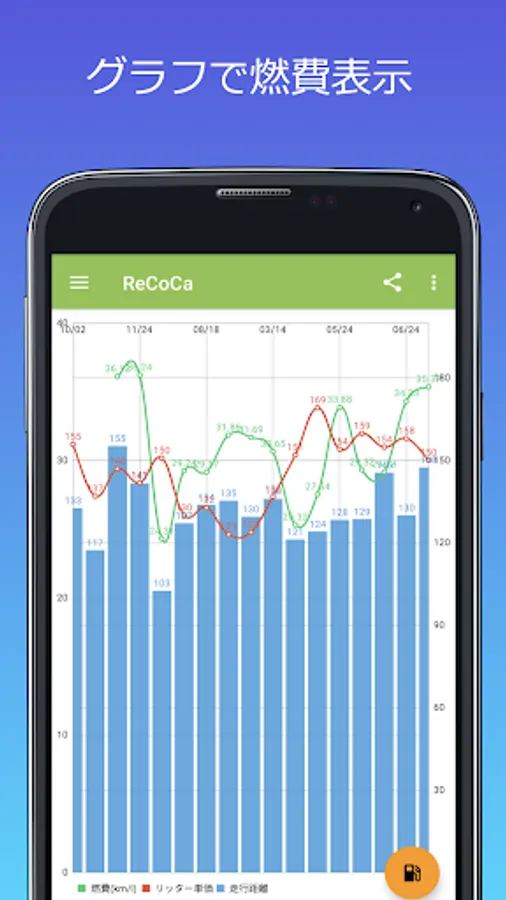 On the graph screen, fuel consumption and gasoline unit price are displayed as a line graph.
