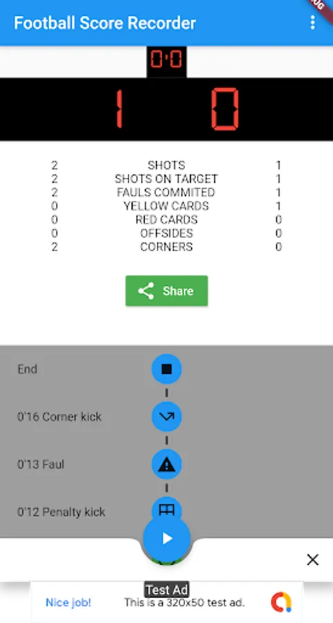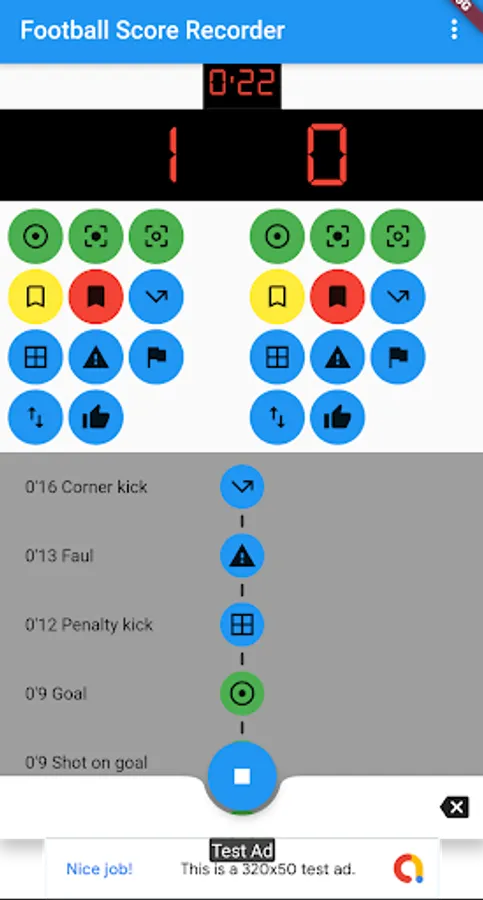 This app helps you to record the football game score and stats like num of shots, shots on target, red/yellow cards, corners and penalty etc.