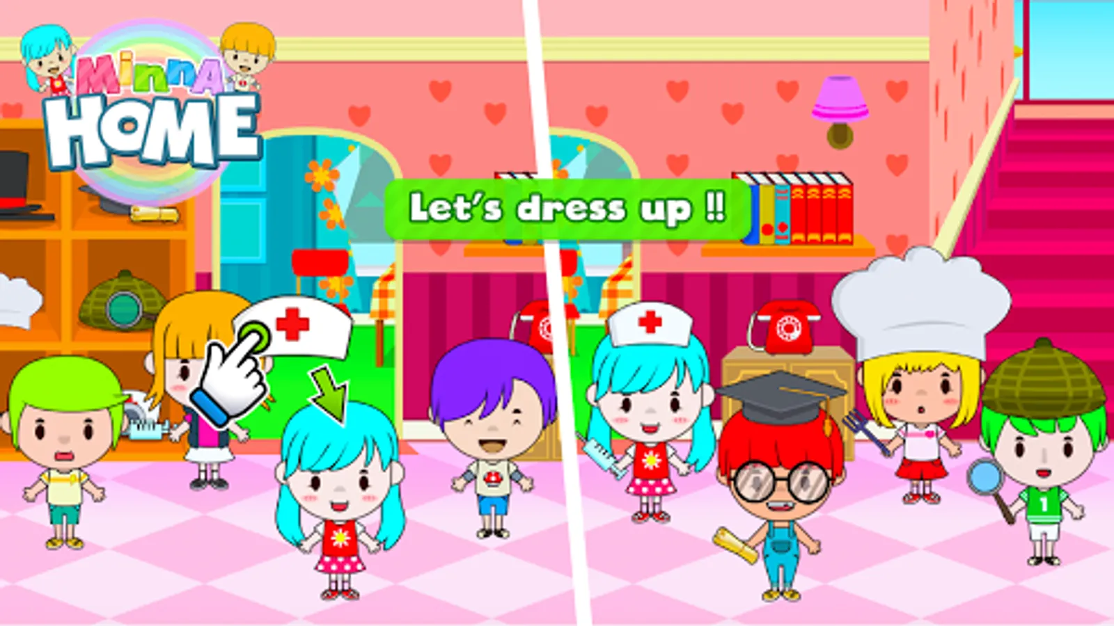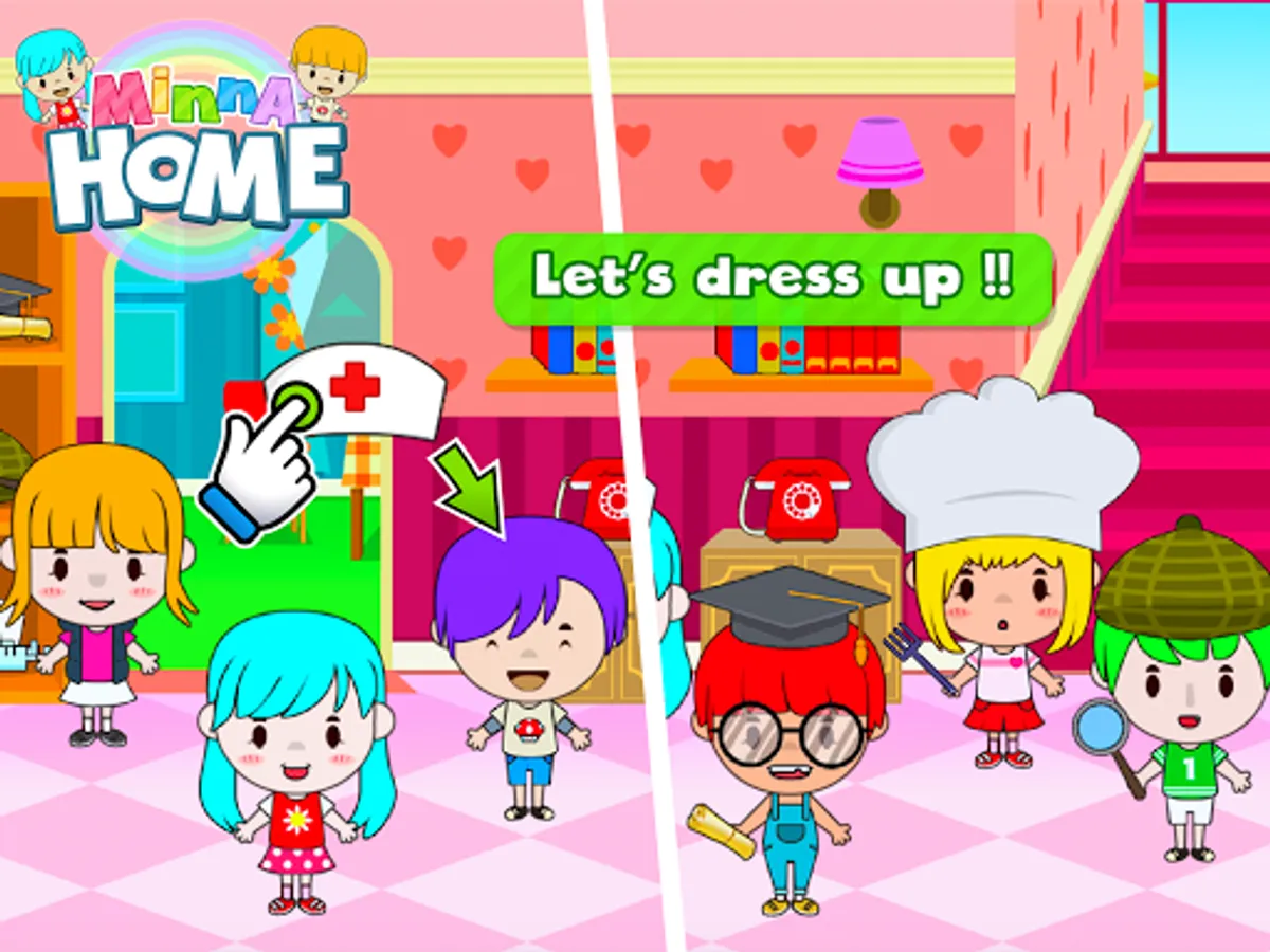 We have a lot of petty cute characters for you to pretend role, you can click on the heart button on the left of the screen, then drag and drop the character to the playroom you are want and click or drag to pretend to be based on your mind. And you can also dress up or add or remove the accessories to the characters freely same your dress up dollhouse.