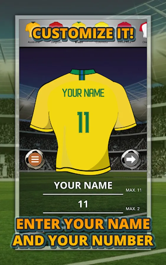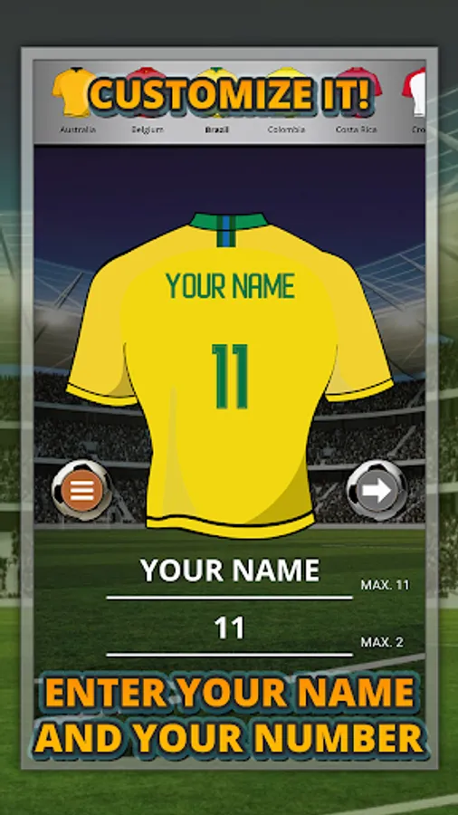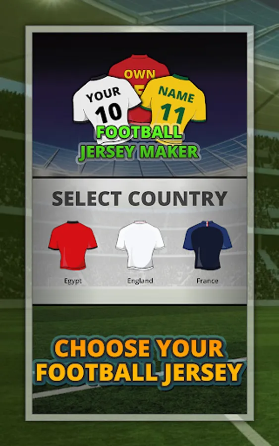 You can create football jerseys for Argentina, Australia, Belgium, Brazil, Colombia, Costa Rica, Croatia, Denmark, Egypt, England, France, Germany, Iceland, Iran, Japan, Mexico, Morocco, Nigeria, Panama, Peru, Poland, Portugal, Russia, Saudi Arabia, Senegal, Serbia, South Korea, Spain, Sweden, Switzerland, Tunisia, Uruguay.