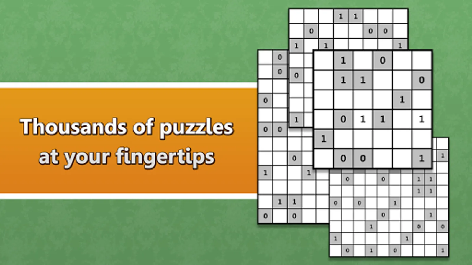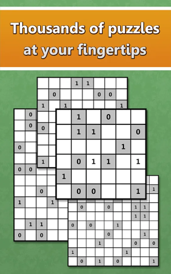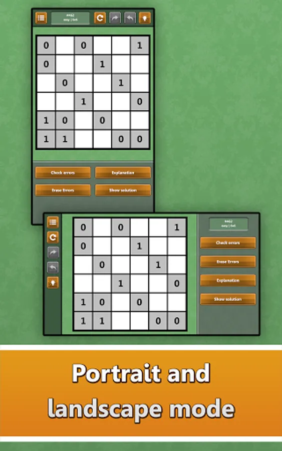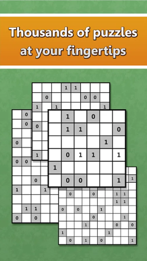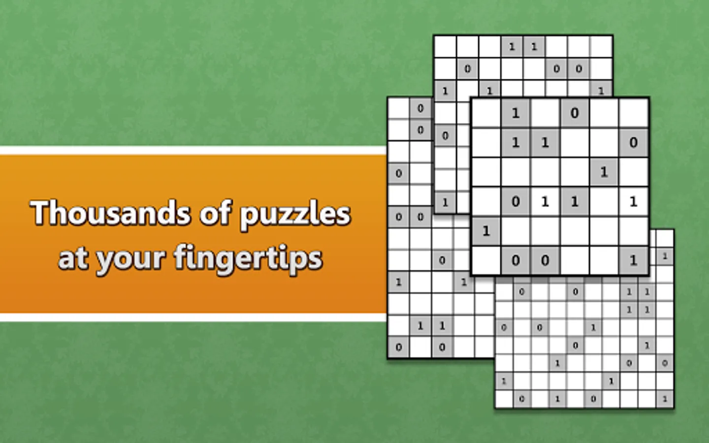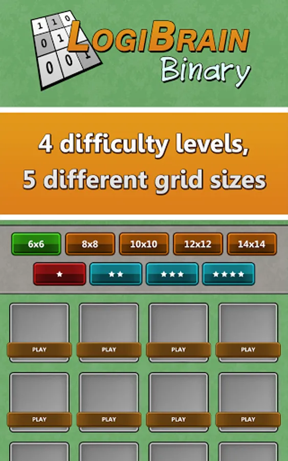 LogiBrain Binary includes 2000+ puzzles in different sizes and different levels of difficulty; easy (1 star), medium (2 stars), hard (3 stars), very hard (4 stars);