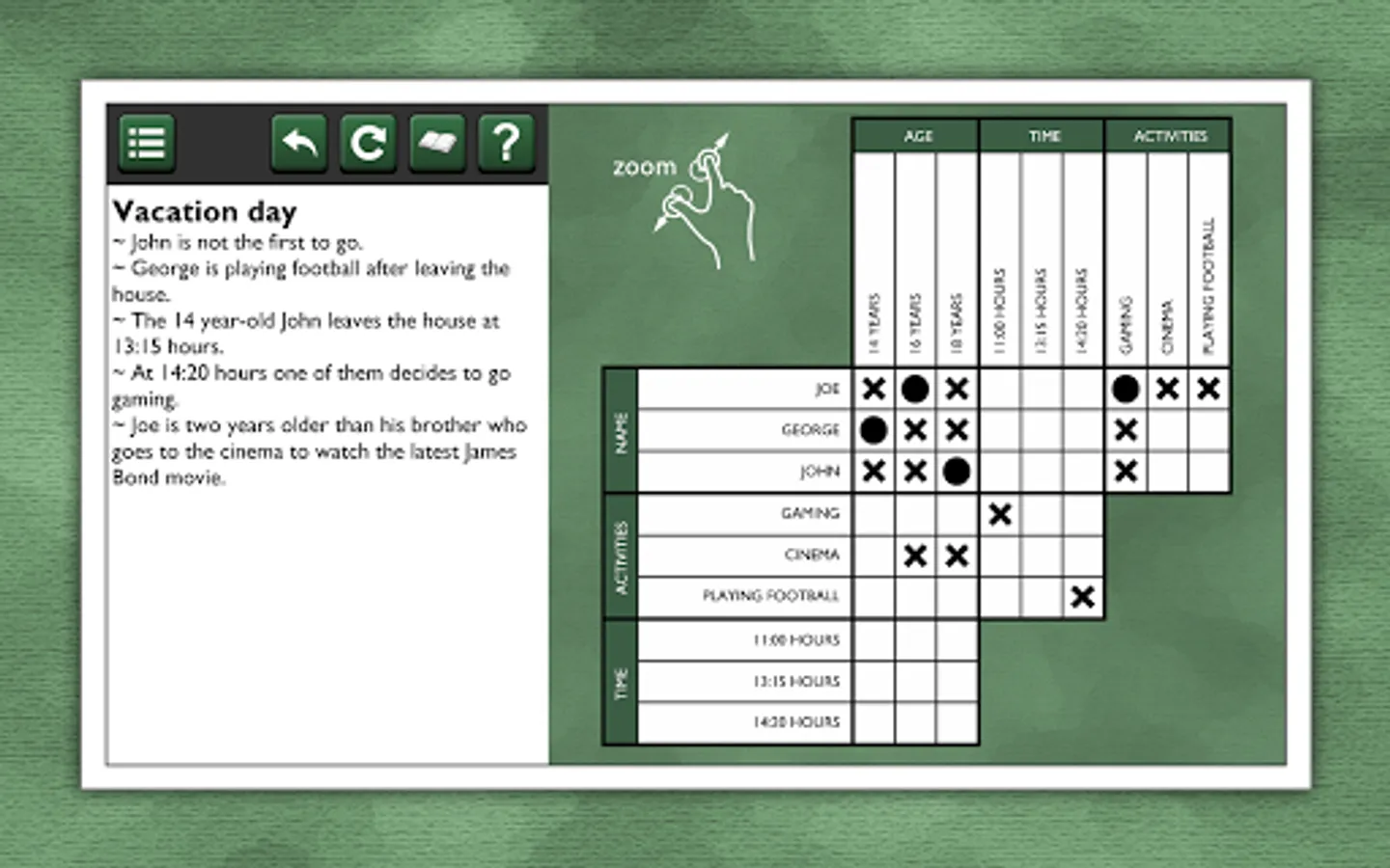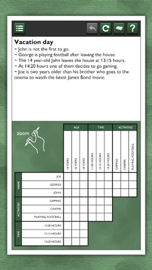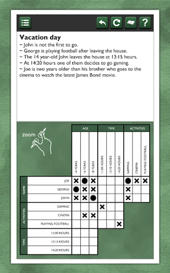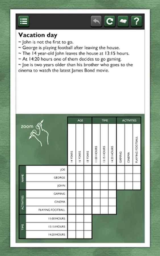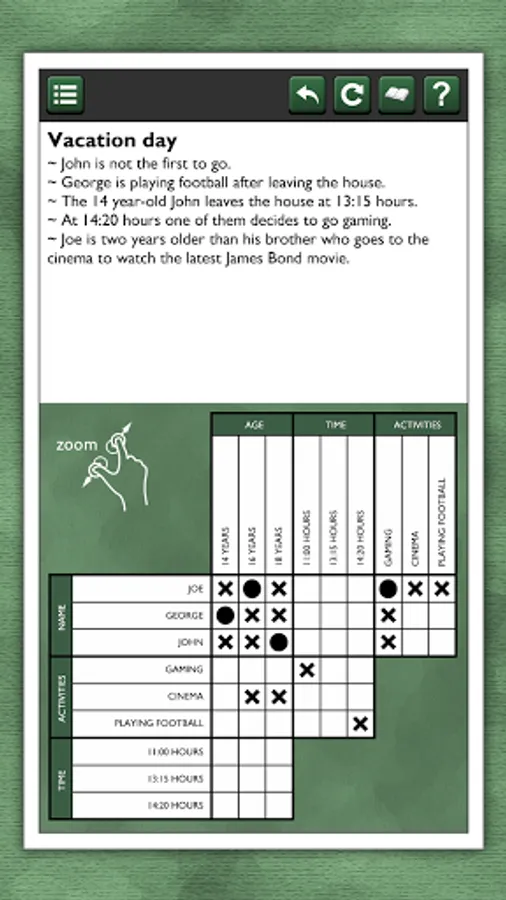 These logic puzzles are for the true logic problem fanatic! Try 20 puzzles for free. If you like it, more packages are available for in-app purchase, each with 20 unique puzzles, for hours of puzzling fun!