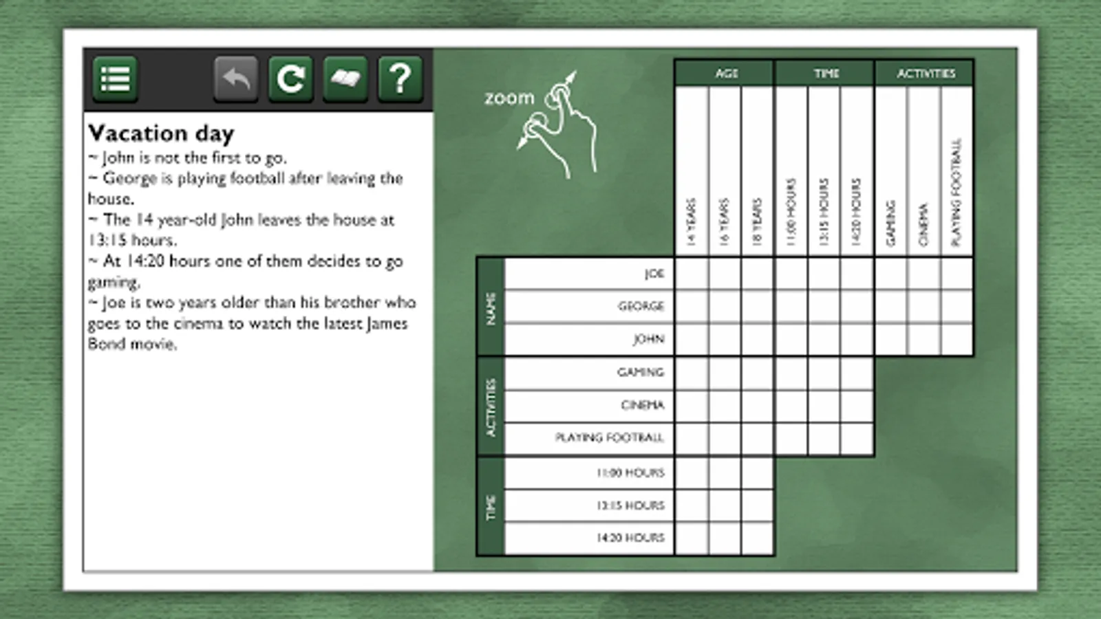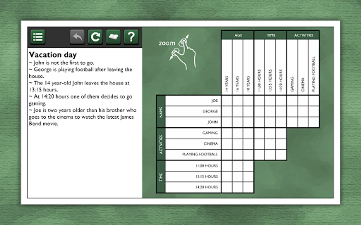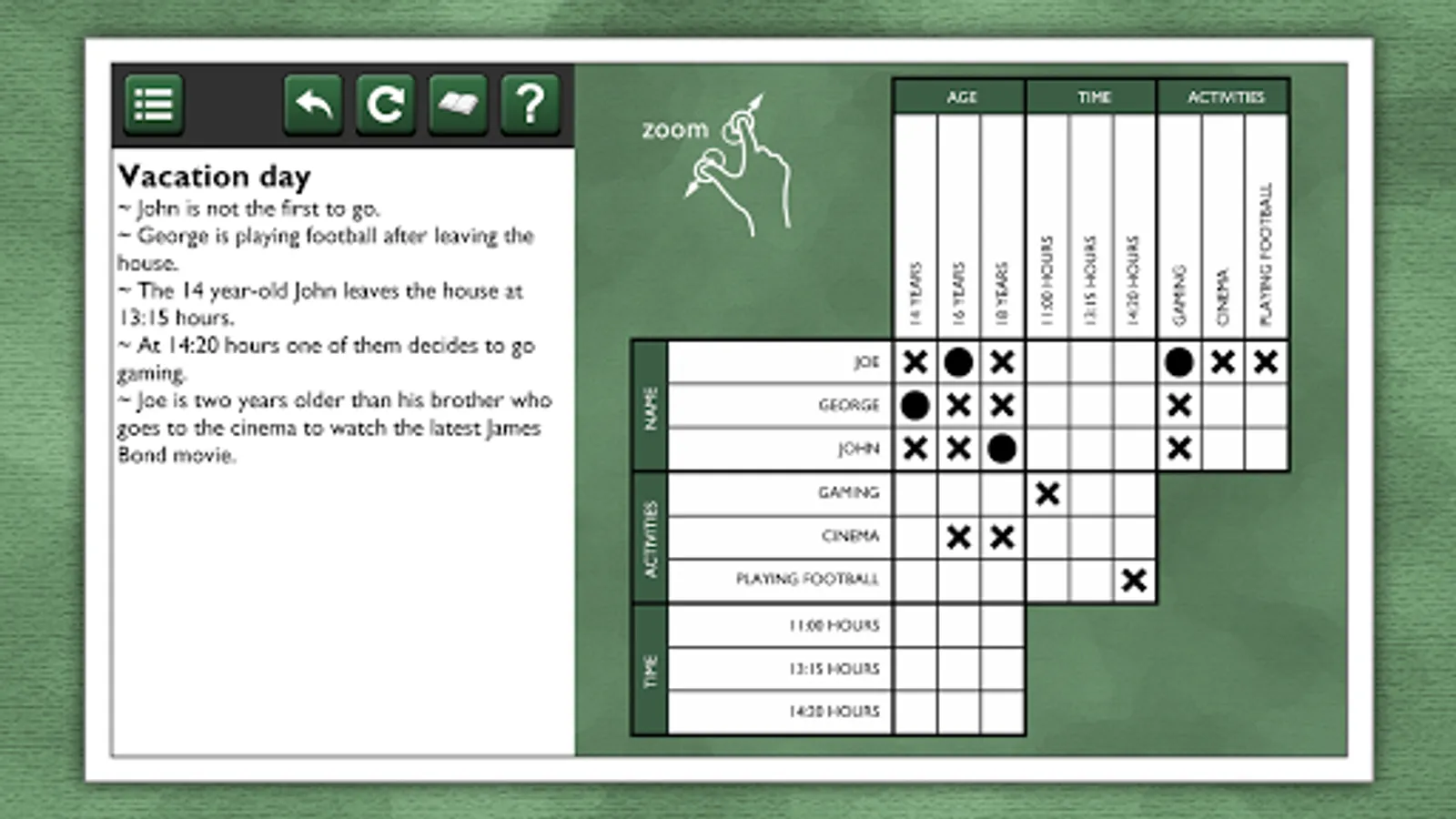 These logic puzzles are for the true logic problem fanatic! Try 20 puzzles for free. If you like it, more packages are available for in-app purchase, each with 20 unique puzzles, for hours of puzzling fun!