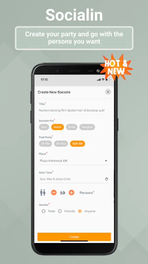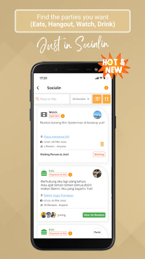 Let's find people to meet. Invite people to join your dinner, watching, drinking, or hangout together. You can decide who pays for the bill...