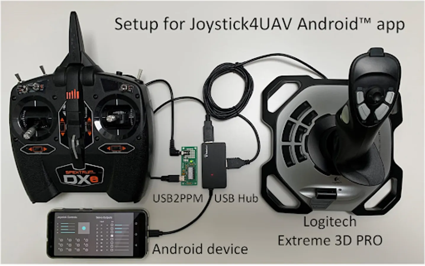 With the Joystick4UAV app you can control your multicopter with a joystick. The app is based on the Joystick2PPM app and has been extended specially for the use with a multicopter by supporting six flight modes. Please refer to the picture below for the system setup and to the app web page for more information.