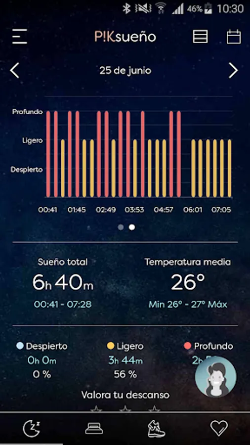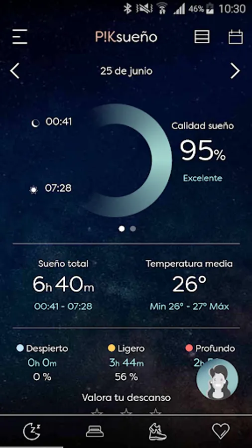 - Sleep mode (P! Ksueño): Complete analysis of sleep divided into phases (light, deep and awake), bedroom temperature (minimum, average and maximum). Possibility of evaluating your rest with all those elements that may have affected you. Your Coach will offer you a daily / weekly / monthly report on your rest and will propose hilarious challenges to guarantee that you enjoy your night and your day to the fullest.