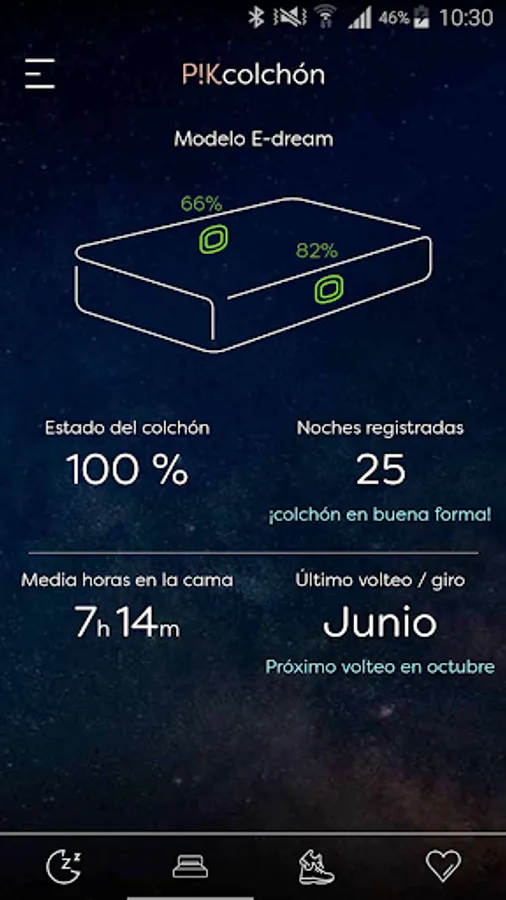 - Mattress mode: (P! K mattress): Now you can know the state of your mattress, when to turn / flip it, and the average hours in bed as well as information about your mattress by clicking on the image of your mattress. You can know when you will have to change the batteries of your smart devices.