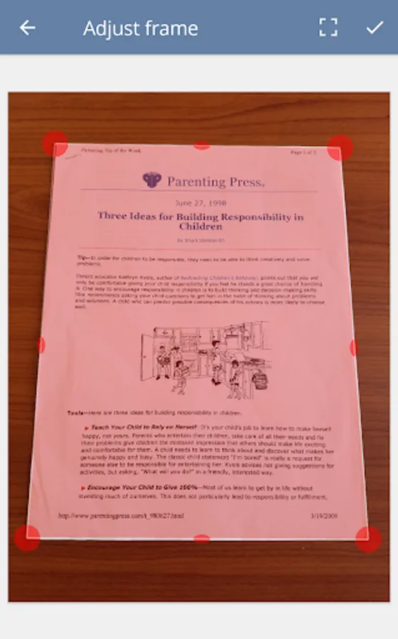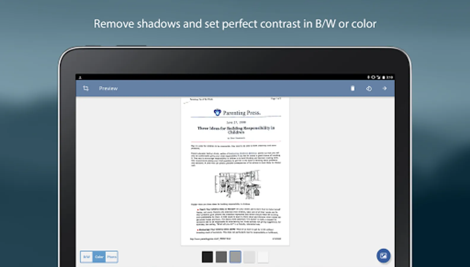 TurboScan uses advanced fast algorithms to accurately detect document edges, straighten the documents (correct perspective), eliminate shadows and set a perfect contrast - black on white.