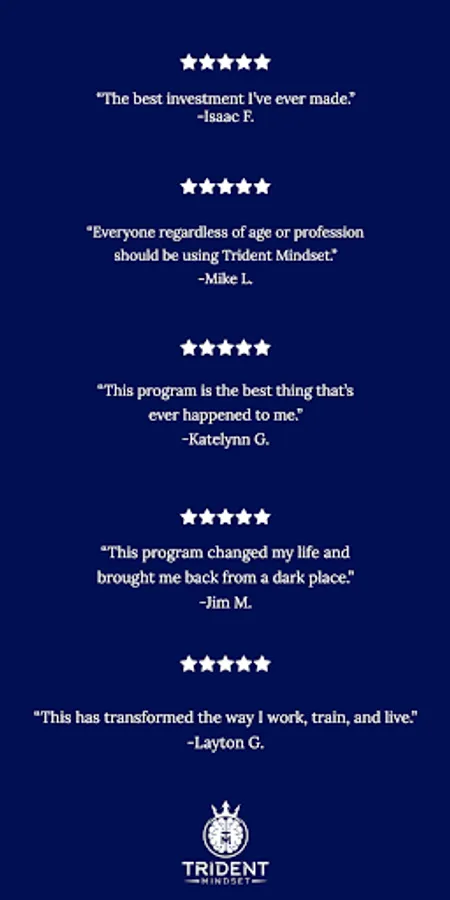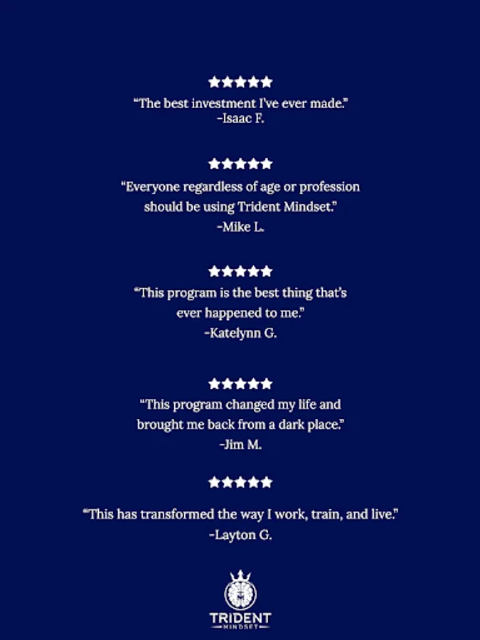 Trident Mindset is a mental health and mental toughness training program created by Navy SEALs, intelligence operatives, and neuroscientists that teaches proven tactics for reducing stress, increasing happiness, and thriving during adversity.