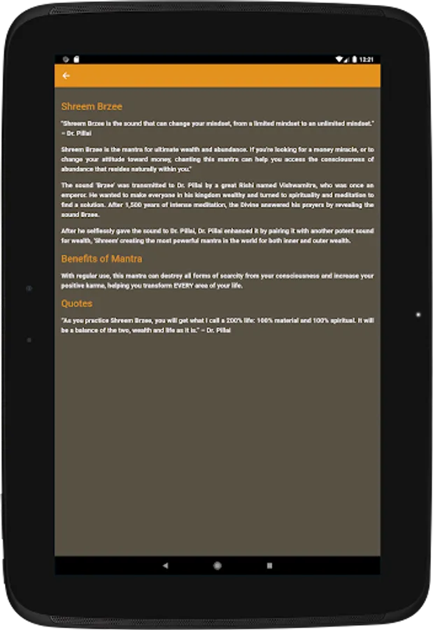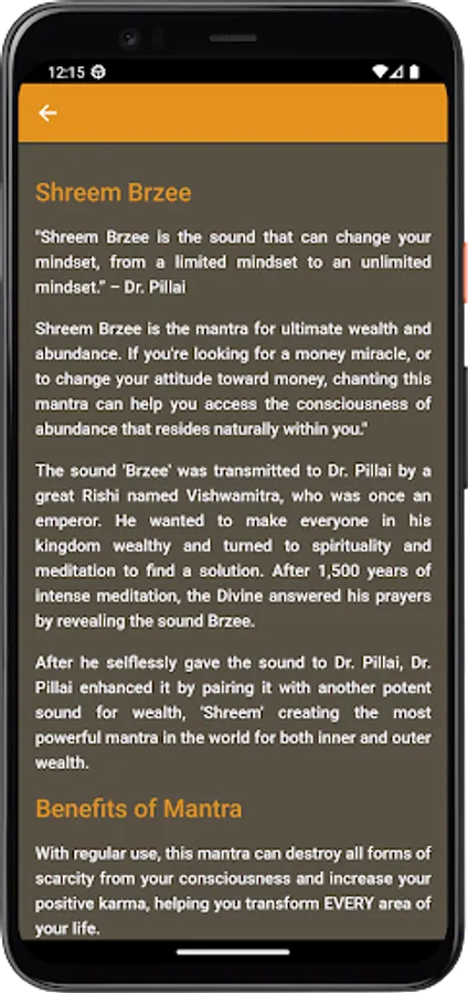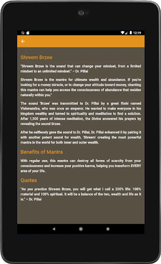 Shreem Brzee is a special App (application), which helps you stay connected with Lakshmi, the Goddess of wealth and be surrounded with her positive vibrations through the ultimate wealth mantra — the Shreem Brzee. This App features the mantra to be played exclusively during the Venus Hora (power time of Goddess Lakshmi) every day in your own recorded voice or in Dr. Pillai’s mesmeric voice. The App features divine mantras for Goddess Lakshmi such as Lakshmi Gayatri mantra, Soundarya Lahari, Kanaka Dhara mantra and many more, both for free and paid usage.
