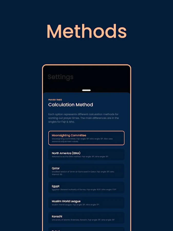 Multiple Calculation Methods – choose the perfect Prayer calculation method for you depending on your location and preferences.