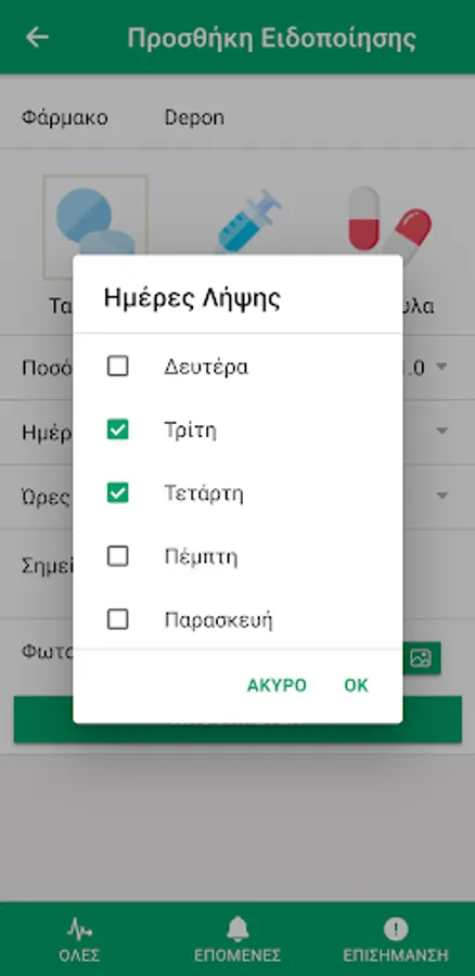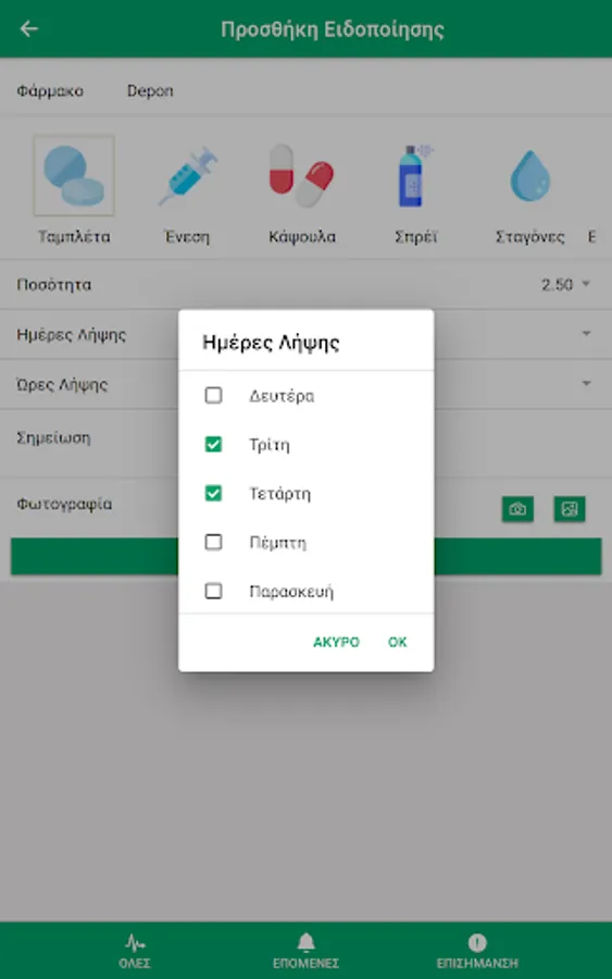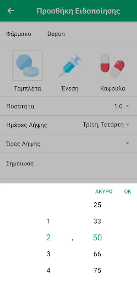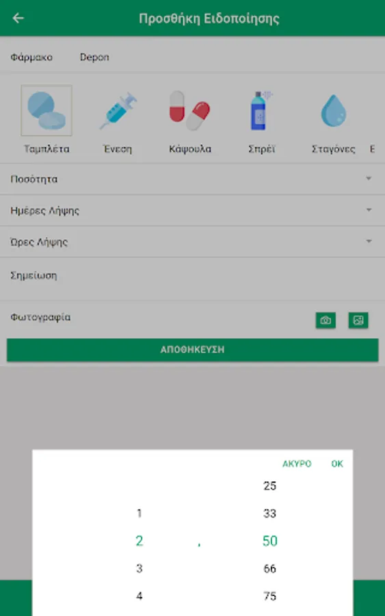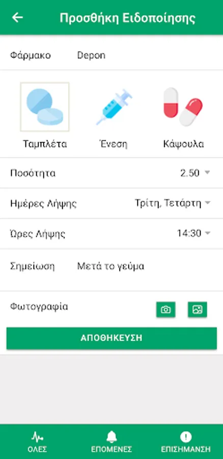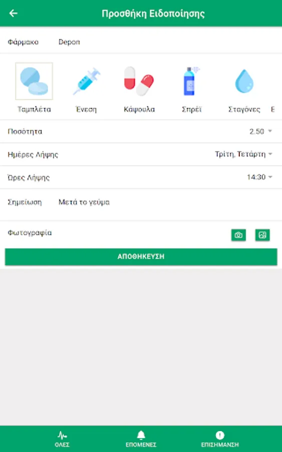Enter the drug name (the name of the medicine) and the time/day at which each dose must be taken