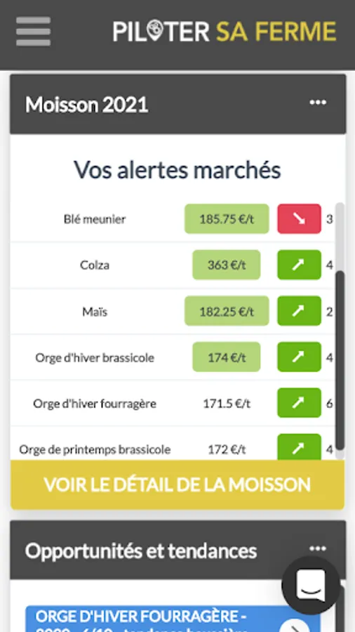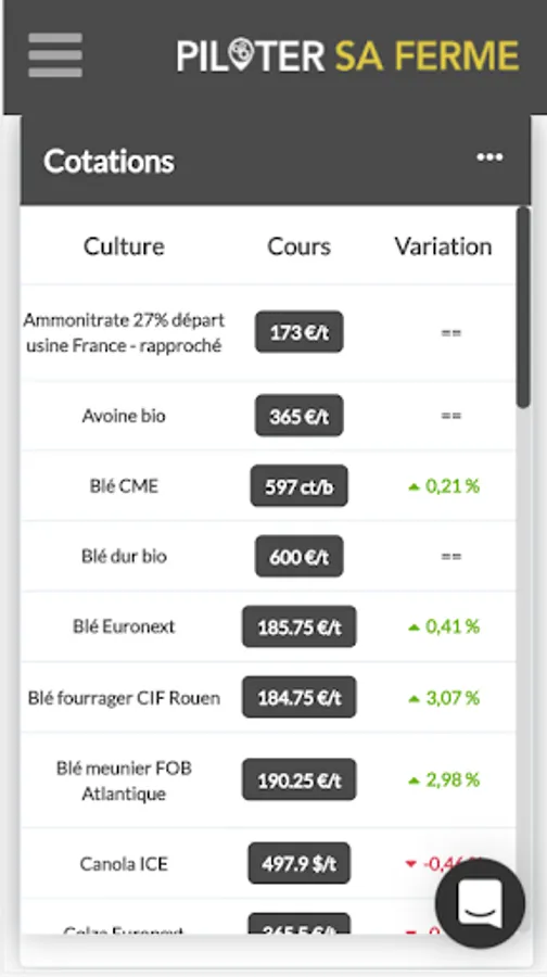 - more than 100 quotations are available, follow the evolution of agricultural commodities prices: Euronext, CBOT, wheat spot, barley, rapeseed, sunflower, corn, etc.