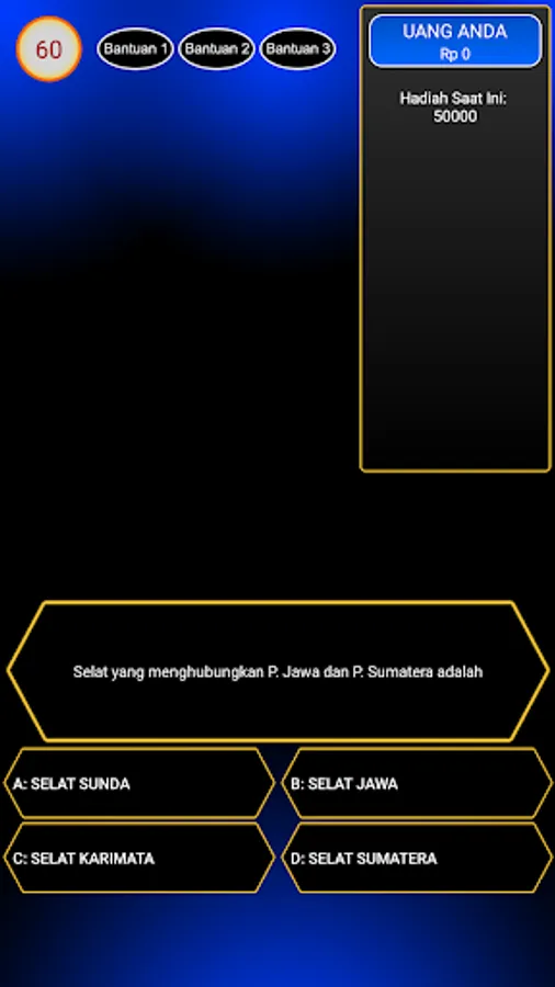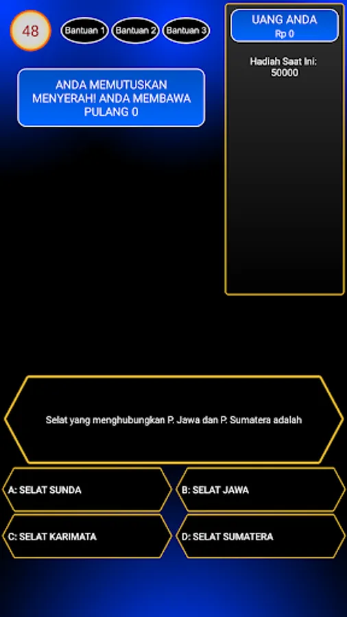 This game requires you to answer several questions with 4 answer choices. In addition, you are also given 3 help, that is, each help will eliminate one wrong answer.