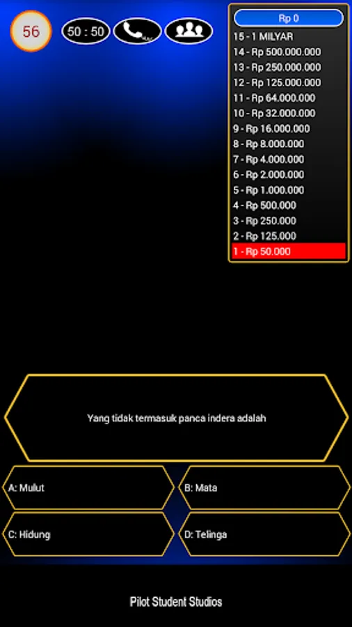 Aplikasi kuis yang mengharuskan anda menjawab pertanyaan-pertanyaan yang ada. Setiap pertanyaan memiliki nilai uang yang akan bertambah setiap levelnya.