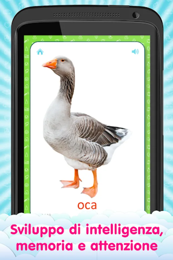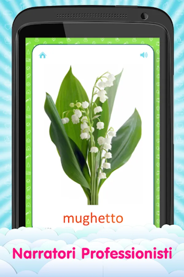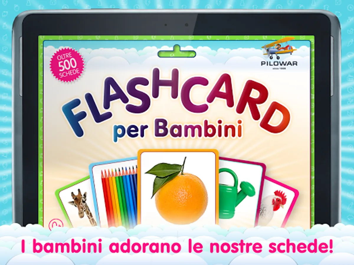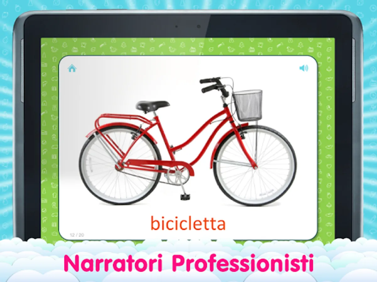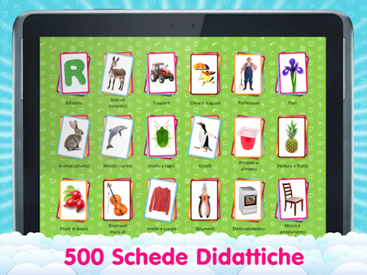 The application has 500 sound flashcards in Italian language with bright images which are divided into topics.