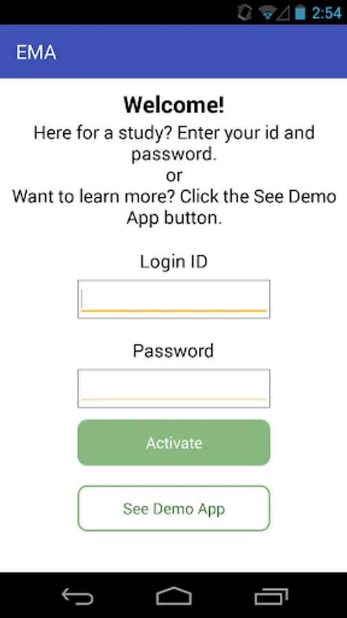 This app is intended for people who are enrolled in a research study. You need login information, provided separately, to be an active participant in a study. If you want to learn more about Ecological Momentary Assessments, or see how PiLR EMA works select the See Demo App button after you download the application.