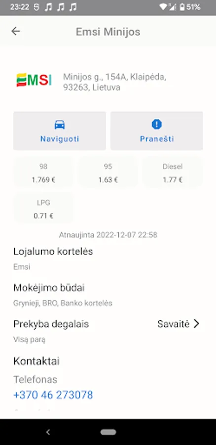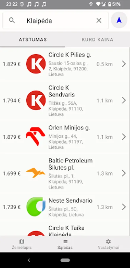 Pilu.lt monitors fuel prices, regularly updates them and conveniently presents them in the app. Search for the nearest or cheapest gas station according to your location or by entering the name of a city or settlement.