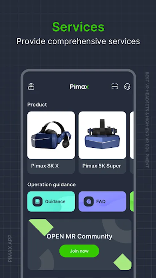 Pimax VR is a tool app that helps users experience Pimax VR devices. Users can get multi-dimensional, comprehensive and detailed services and enjoy VR time more happily.