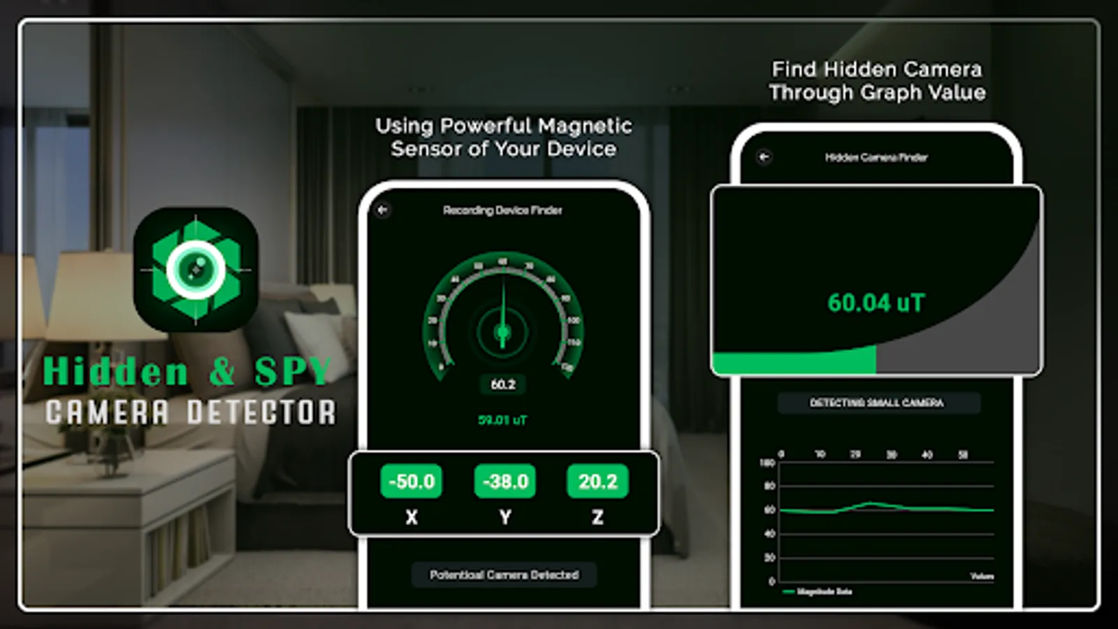 🟌Spy devices detector and & hidden camera finder and Hidden Camera Detector, Spycam app works best detecting detective camera and metal cameras up to 15 cm away and working best detecting ferromagnetic materials such as hidden camera, speaker and other so many spy devices.