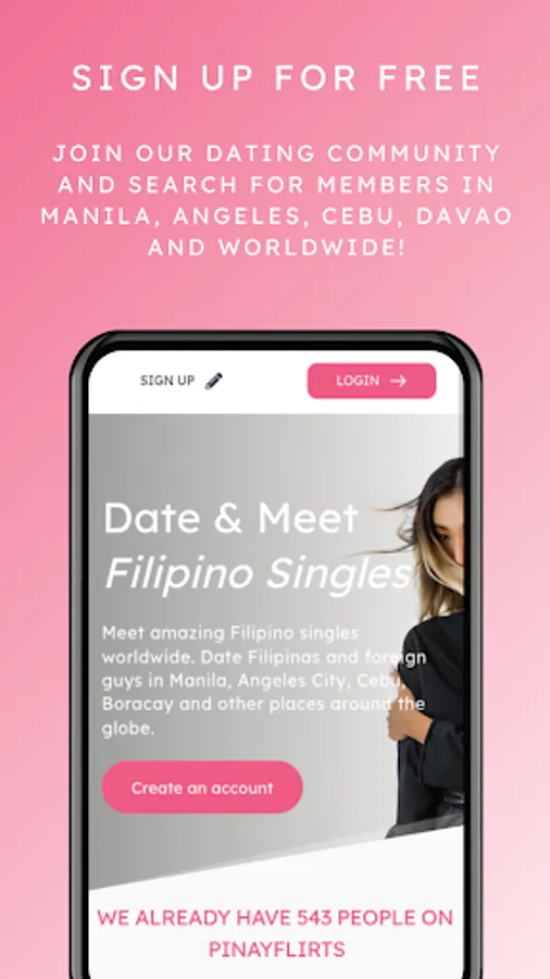 PinayFlirts is the best app to meet amazing Filipino singles in the Philippines and worldwide! Browse through profiles of Filipina girls and foreign men in Manila, Cebu, Angeles, Davao, Boracay and all over the world! 💞🇵ðŸ‡ðŸ’ž
