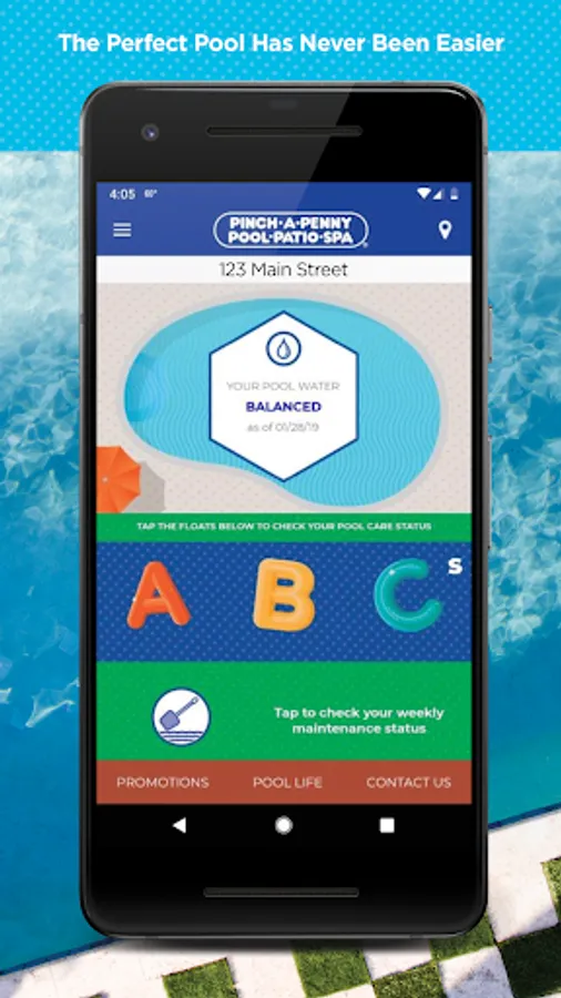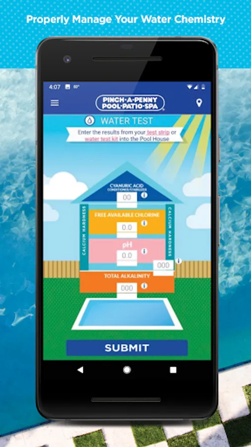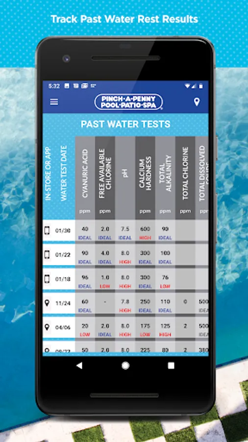The Pinch A Penny Mobile App makes it possible for you to have the perfect pool all year. You can easily test for Free Available Chlorine, pH, Calcium Hardness, Alkalinity and Cyanuric Acid using a test strip or liquid test kit, and also get solutions for combating algae or cloudy water. Once you enter your results into the app, it’ll give you a detailed prescription that is specific to your pool. You can also easily track results from both the app or water tests from your local Pinch A Penny.
