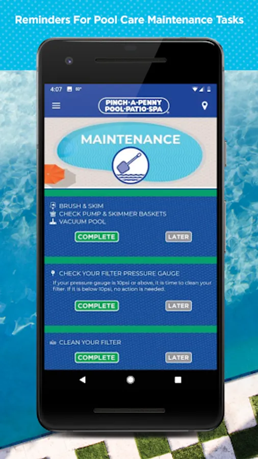 The app will also send you weekly, monthly and quarterly pool maintenance notifications that include: