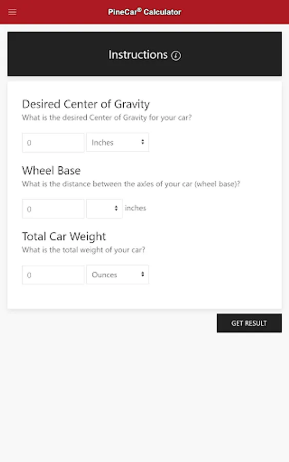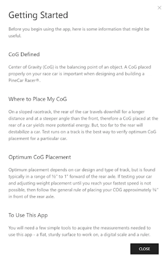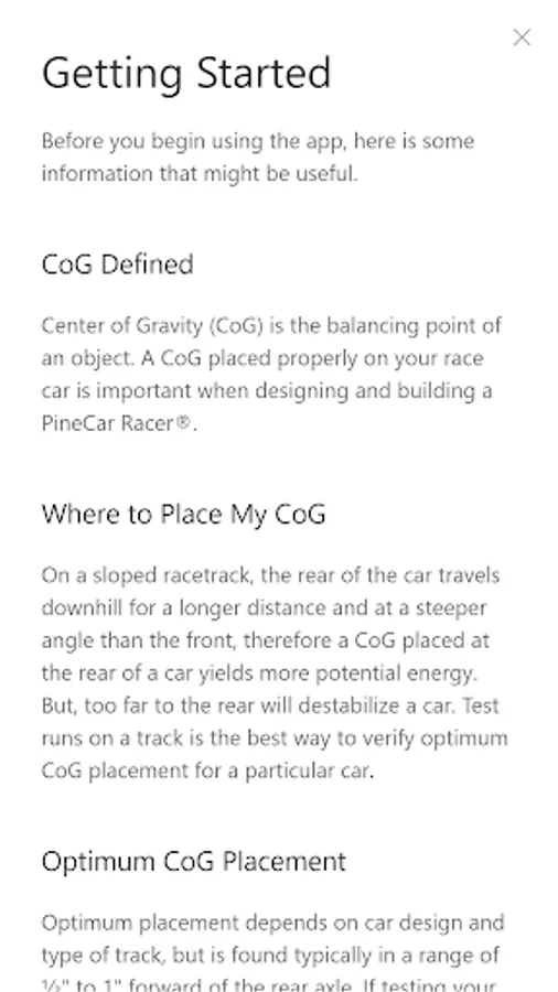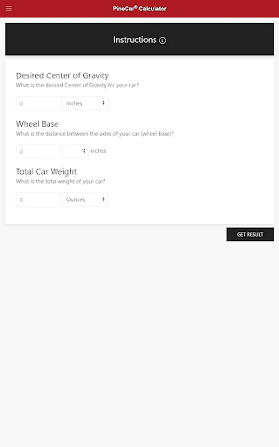 The must-have app for building the fastest PineCar Derby racer on the track. Instantly find your car’s center of gravity, or calculate the amount of weight you need on your front axle to place your center of gravity where you want it.