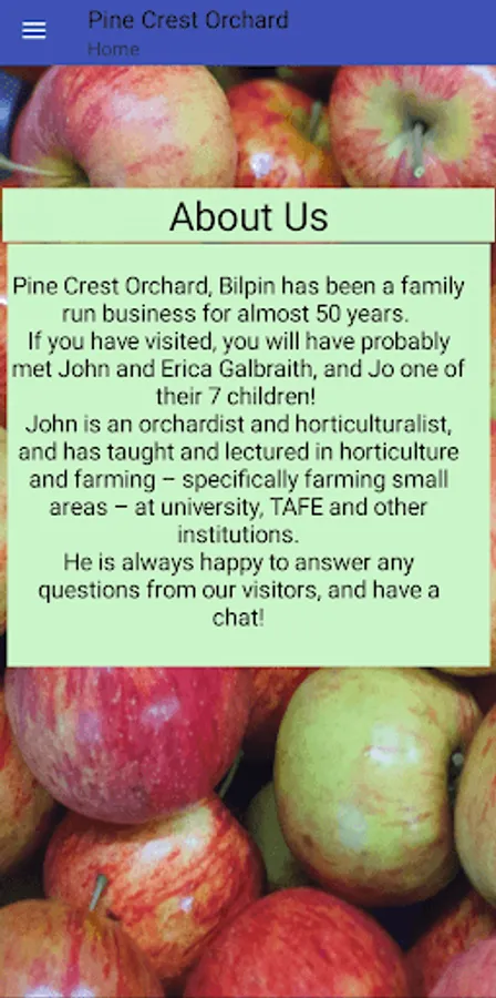 Pine Crest Orchard, Bilpin has been a family run business for more than 40 years. John Galbraith is an orchardist and horticulturalist, and has taught and lectured in horticulture and farming – specifically farming small areas – at university, TAFE and other institutions.