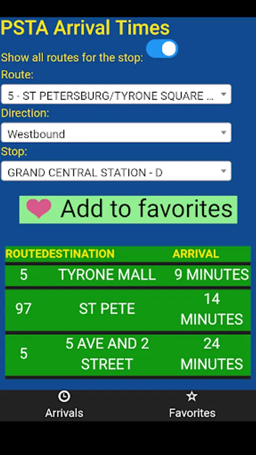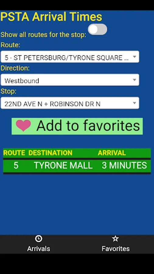 Simply select a route, direction and stop to see the next bus arrivals. Save your favorite stops to see upcoming arrivals with a single touch.