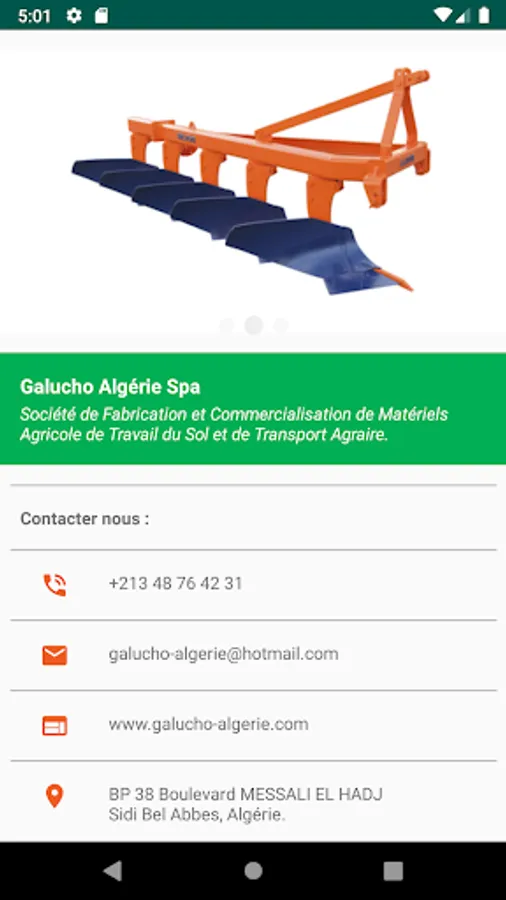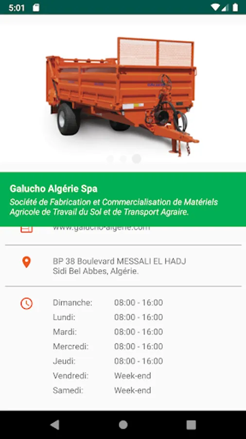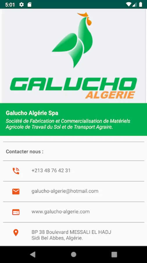 Contact card with phone, map and web autolinks plus opening times, The information of Galucho Algerie Spa a Company of Manufacture & Marketing of Agricultural Materials of Tillage and Land Transport located in Sidi Bel Abbes, Algeria.