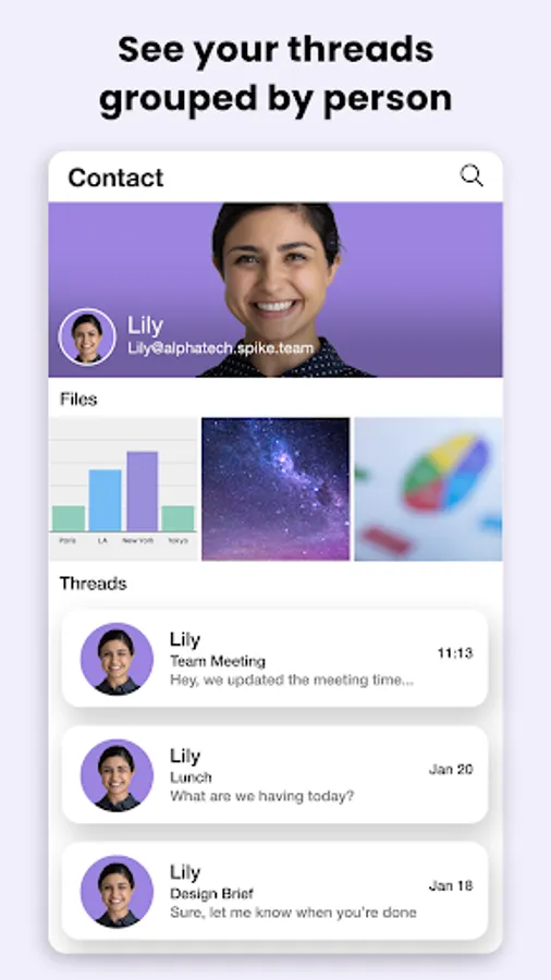 Emails are grouped by person so you see all messages and files with that person in a conversational view