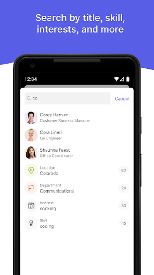 Search the directory for answers to everyday questions. Find coworkers by name, office location, skills, interests, and more. Learn more about the people you work with through rich profiles that go beyond the basics.