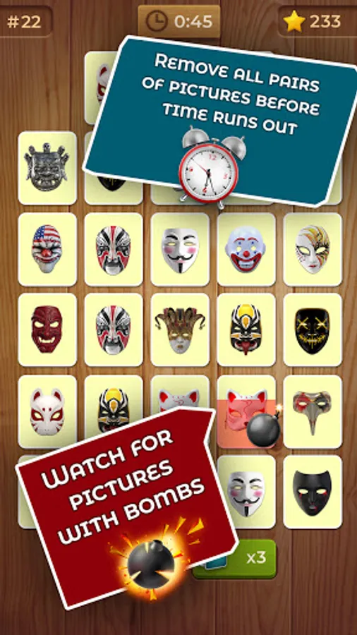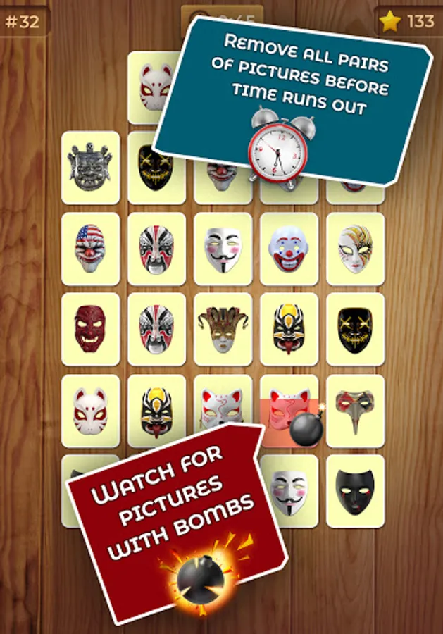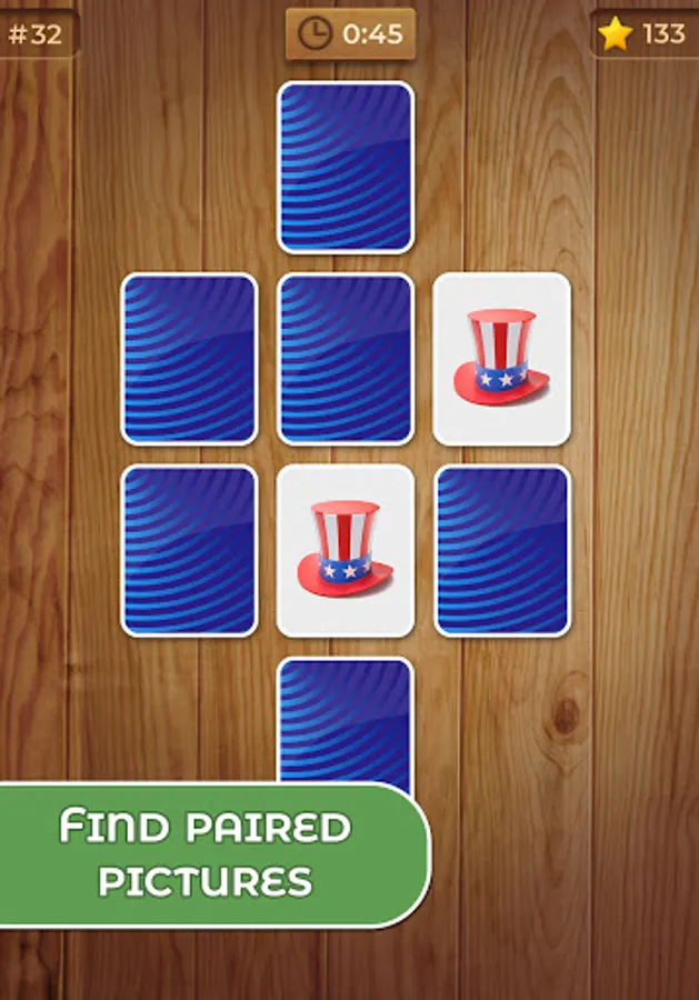 Remember the location of the same pictures, wait until all the pictures turn over and find all the paired pictures before the time runs out.