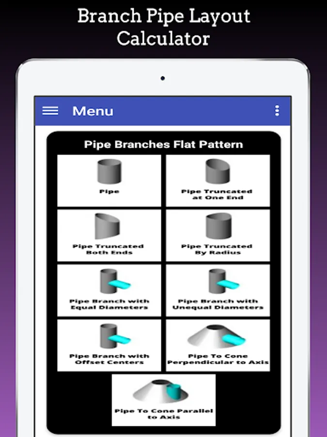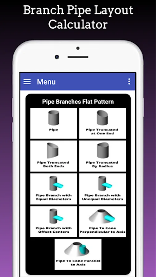 Branch Pipe Layout App build to Get Flat Pattern Layout or Fabrication Layout for Plain Pipe or Shell, Pipe to Pipe Intersection at 90 Deg with Equal Diameter, Pipe to Pipe Intersection at 90 Deg. with unequal Diameter with offset distance, Pipe or Nozzle to Cone Intersection at 90 Deg or Pipe or Nozzle to Cone Intersection with Parallel Axis.
