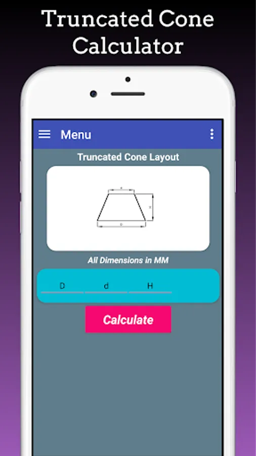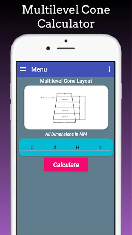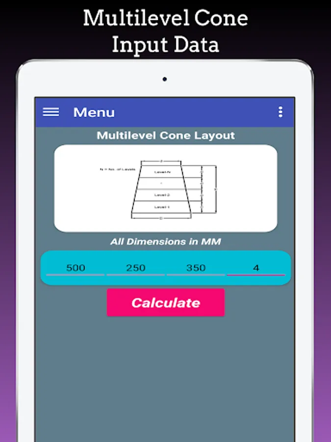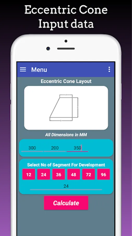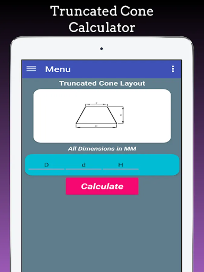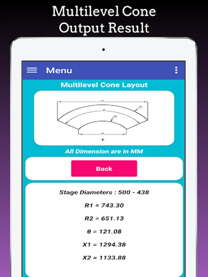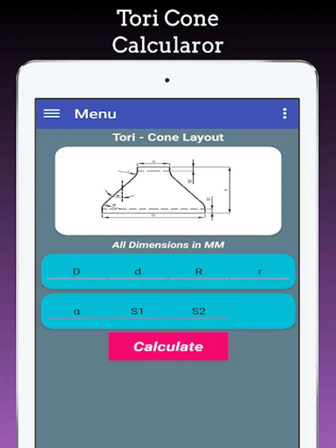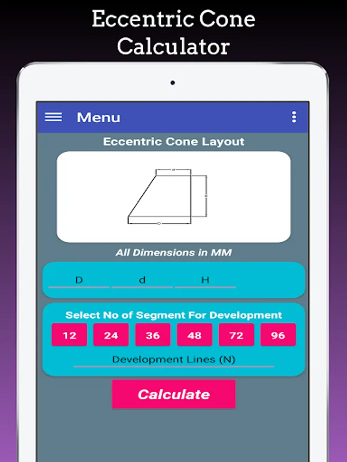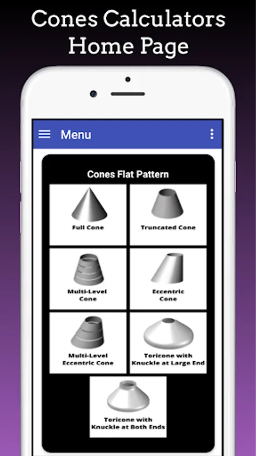 Cones Calculator App is used to calculates flat Pattern layouts developments of Full Cone, Half Cone , Truncated Cone,Concentric Cone, Frustum Cone, Eccentric Cone, Tori Cone, Multi-level Concentric Cones, Multi-level eccentric Cones, Cone with Knuckles.