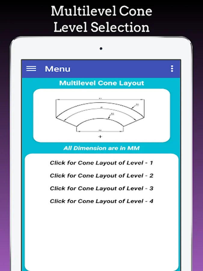 Multi-Level Cone: Multi level Cone option is used layout cone with 8 no of levels that cone is divided height wise and layout of the same is done in this app. You can take layout of the each part by selecting in level page. This is helpful when we have limitation in Sheet size to Fit Big size Cone so we can divide in to parts and after cutting parts in no of levels join it by welding. In this Cone you required to input as Large Diameter, Small Diameter, Cone Height and No. of Levels or No of Parts you have to make it.