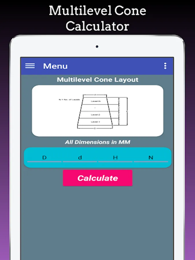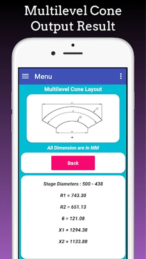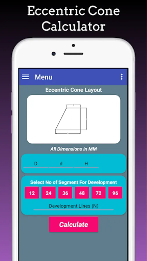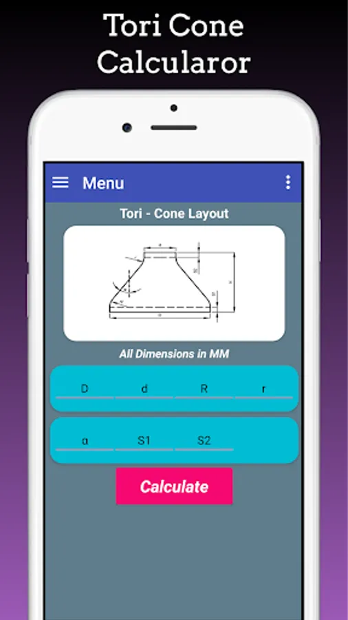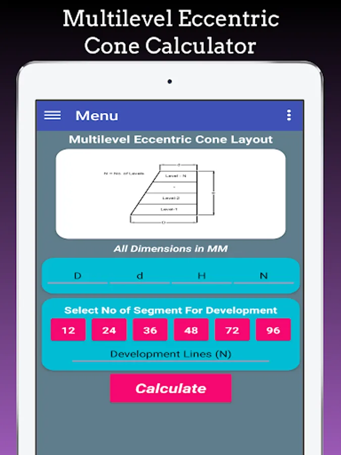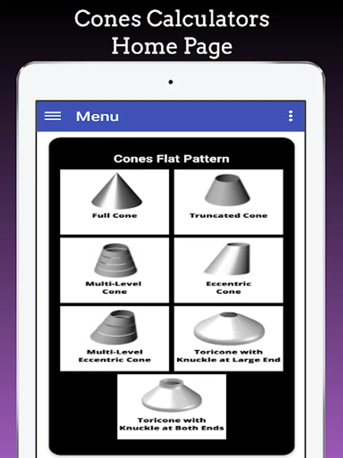 Cones Calculator App is used to calculates flat Pattern layouts developments of Full Cone, Half Cone , Truncated Cone,Concentric Cone, Eccentric Cone, Tori Cone, Multi-level Concentric Cones, Multi-level eccentric Cones, Cone with Knuckle, Cones with Knuckle at top, Cone with knuckle at bottom.