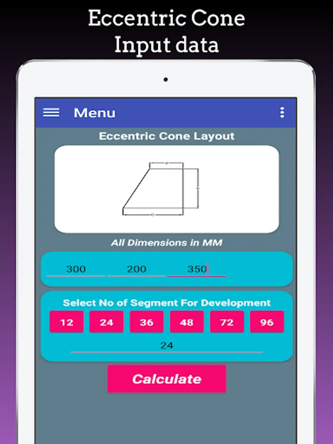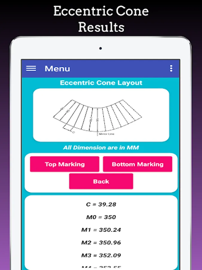 This app is very useful in daily fabrication activity for lay outing cones. This app helps to Fabrication Engineer, Fabrication Fitter, Production Engineer, Quality Engineer, Design Engineer, Costing and Estimating Engineer, Fabrication Contractor, Workshop Supervisor, Fabrication shop, Piping Engineer, Process Equipment manufacturers, Pressure Vessels Fabricators, Heat Ex-changer Manufacturers, Storage tank Manufacturers.