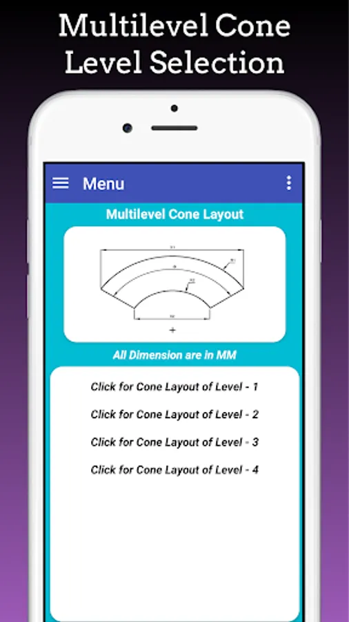 Multi-Level Cone: Multi level Cone option is used layout cone with 8 no of levels that cone is divided height wise and layout of the same is done in this app. You can take layout of the each part by selecting in level page. This is helpful when we have limitation in Sheet size to Fit Big size Cone so we can divide in to parts and after cutting parts in no of levels join it by welding. In this Cone you required to input as Large Diameter, Small Diameter, Cone Height and No. of Levels or No of Parts you have to make it.